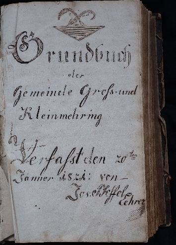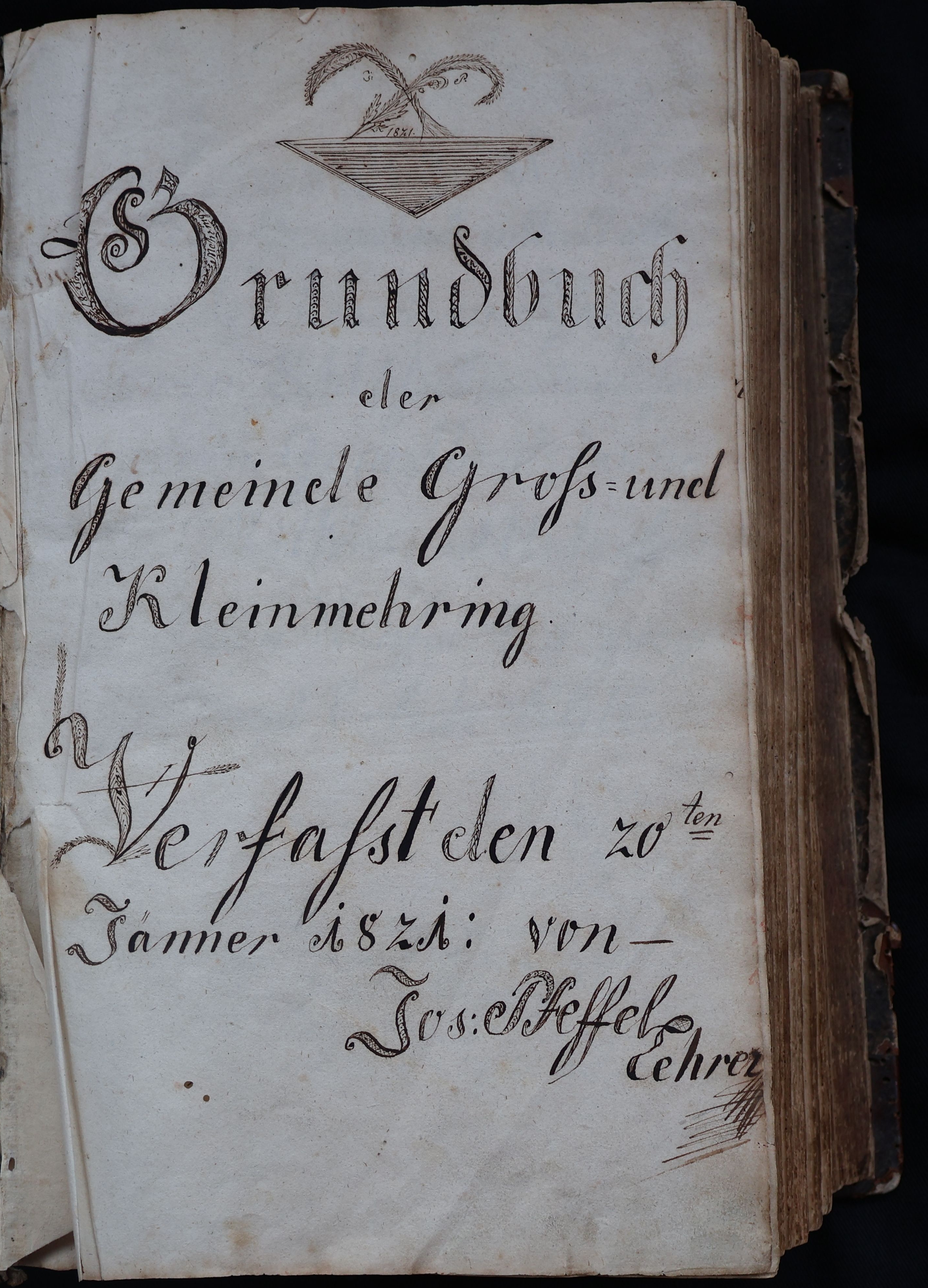 Lehrer Pfeffel hat die Mehringer Flur beschrieben und vermessen und in dem Grundbuch von 1821 zusammengefasst. Das Grundbuch ist in Privatbesitz.