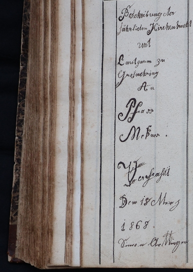Die Beschreibung der jährlichen Kirchenpacht und Laub??? zu Großmehring an Pfarr Meßner wurde am 18. März 1868 verfasst. Als Verfasser steht Simon Arttinger.