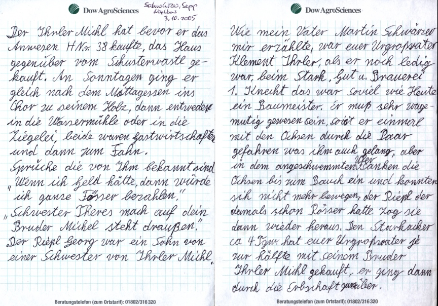 Mein Onkel mütterlicherseits Hans (Mentlwastl Hans) sagt, dass der Michl den Ihrlerhof (Haus-Nr. 41, heute Wallner in der Ringstraße 11) verkauft hat und auf die Walz ging. Das könnte erklären, wie der Ihrlerhof an die Donaubauer kam. Offen ist (dies wird noch nachgeforscht werden), ob die Donaubauer, die den Ihrlerhof kauften oder anderweitig erwarben, mit der Mutter vom Michl, die eine geborene Donaubauer war, verwandt sind. Sein Vater Michael starb im Alter von knapp 79 Jahren am 11.10.1901 als Gütler im Haus-Nr. 41. Seine Mutter starb ebenfalls in Haus-Nr. 41 am 17.9.1903. Bereits ein Jahr später ist ein Wendelin Donaubauer auf Haus-Nr. 41 im Sterbebuch belegt: Maria Donaubauer, Kind der Gütlerseheleute Wendelin und Maria Donaubauer starb im Alter von 11 Wochen im Haus-Nr. 41 am 17.10.1904. Wendelin Donaubauer war der Cousin von Michl. Er verkaufte sein Anwesen Haus-Nr. 64 (aus diesem Anwesen stammte die Mutter von Michl, heute Dunz, Sterzl?(1820 heißt es nach den alten Haus-Nummern Haus-Nr. 86, 1828 heißt es Haus-Nr. 66, 1830 Haus-Nr. 65 und 1901 Haus-Nr. 64!)) und zogen auf den Ihrlerhof. Haus-Nr. 64 wurde über einen Juden an ... verkauft. Ab diesem Zeitpunkt blieb dem Anwesen Ihrler nur der Hausname Ihrler, der bis heute noch vereinzelt benutzt wird.