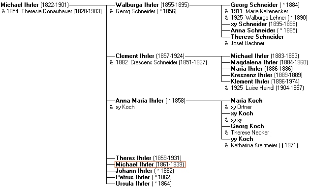Maria Koch war die Schwester vom Michl, Klement und Magdalena Ihrler waren Neffen über seinen 1924 verstorbenen Bruder Klement. Georg Schneider und Theres Bachner waren wahrscheinlich auch Nichten.